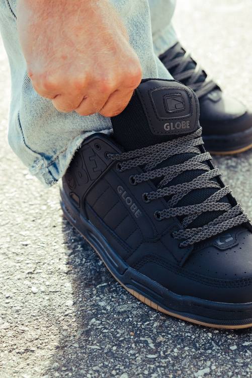 la silhouette de skate classique du patrimoine de Globe. l'inclinaison dans l'ombre sombre/fantôme est dotée d'un col extérieur moulé en TPR pour plus de soutien et de durabilité et d'une semelle stroboscopique Globe avec motif de semelle S-Trac pour une meilleure adhérence et une meilleure sensation de planche. fabriqué à partir d'action et de nubuck synthétique, de textile et de tige en TPR.